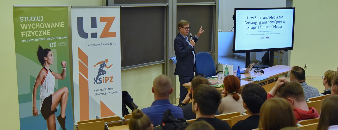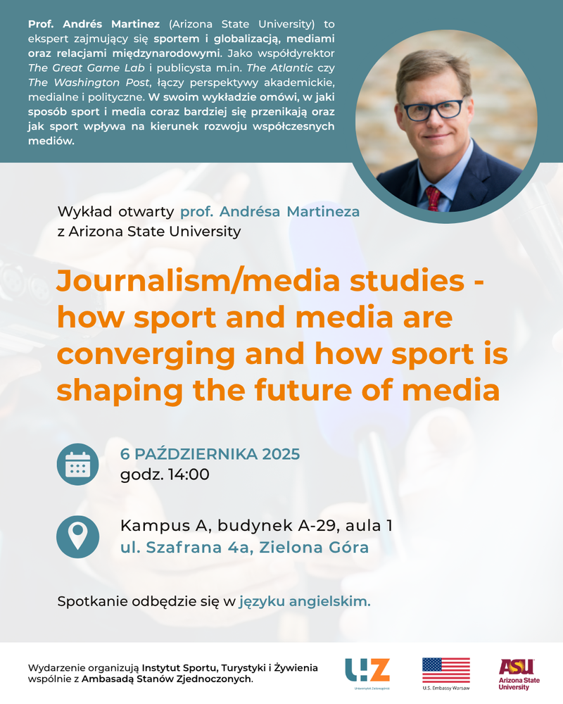 6 października 2025 r. Uniwersytet Zielonogórski gościł prof. Andrésa Martíneza z Arizona State University, eksperta w dziedzinie sportu, globalizacji i mediów, który wygłosił gościnny wykład pt.